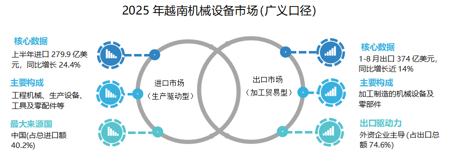 越南是亚洲最具爆发力的基建与工业化新引擎。其经济基本面强劲,2025年GDP增长高达8.02%,建筑业预计在2026年增长14.5%,发展势头迅猛。国家战略驱动下,市场空间巨大:政府规划到2030年投资超650亿美元用于道路改善,高速公路里程将从目前的约1,163公里激增至5,004公里,并陆续启动南北高速铁路、隆城国际机场等一系列总投资预计达900亿美元的超级工程。同时,快速的城市化进程、100万套社会住房计划,以及矿业现代化升级,共同催生了海量需求。当前,越南国内产能仅能满足约20%的机械设备需求,2023年工程机械市场规模为20亿美元,预计到2032年将增长至94亿美元,市场存在巨大缺口。
